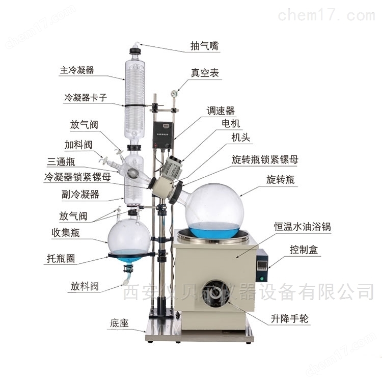 蒸发瓶恒速旋转,水浴锅恒温加热,在此条件下:物料在蒸发瓶内壁形成大面积均匀薄膜快速蒸发,在真空条件下可以提高蒸发效率(需连接真空装置),溶媒蒸汽经玻璃冷凝盘管时冷却成液体(需连接冷却装置),回收于收集瓶。本系列产品使用需配套真空装置(循环水式、旋片式、隔膜式等真空泵),冷却循环装置组成系统装置。