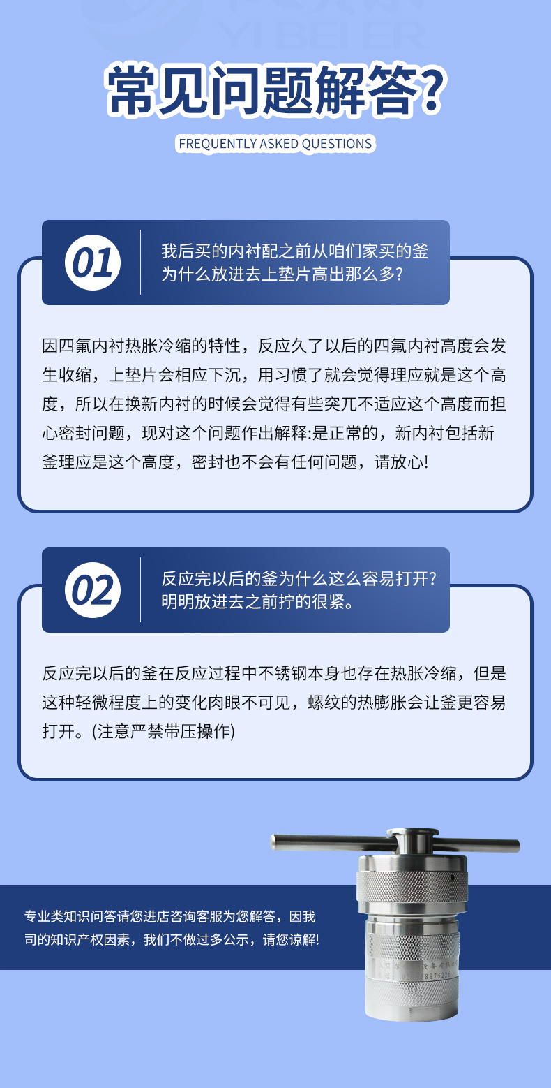 将反应物系指与釜体内。当反应物系有腐蚀性时要将其置于四氟衬套内,方可保证釜体不受腐蚀。按照规定的升温速率升温至所需消解温度(小于规定的安全使用温度)。待消解结束将其降温时,也要严格按照规定的降温速率操作,以利安全和消解罐的使用寿命。当确认腹内温度低于反应物系种溶剂沸点后方能打开上压紧丝进行后续操作。每次使用后要及时将其清洗干净,以免锈蚀。线密封处要格外注意清洗干净,并严防将其碰伤损坏。